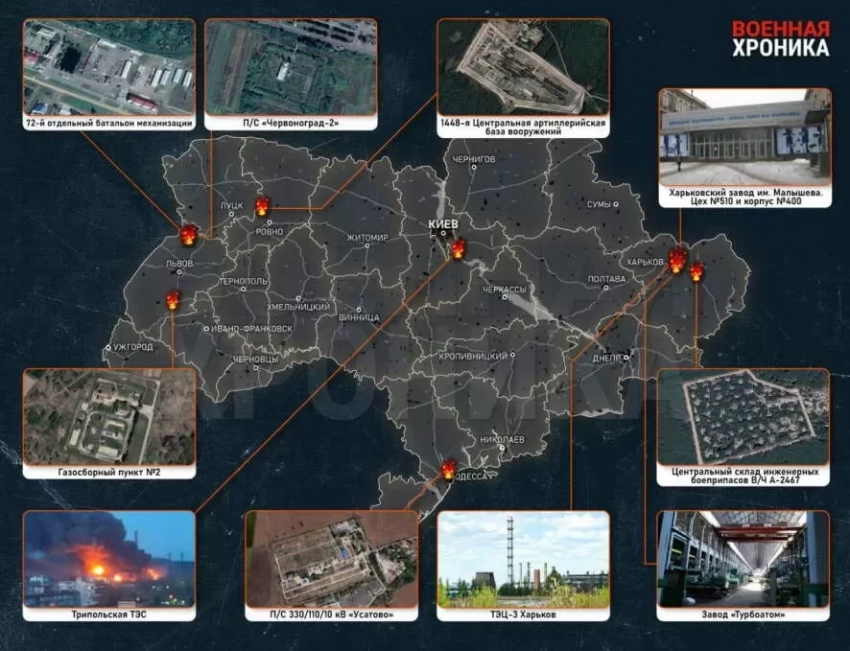Российские войска нанесли комбинированный удар с применением крылатых и аэробаллистических ракет, а также дронами-камикадзе по энергетическим объектам противника в различных областях т.н. Украины.
