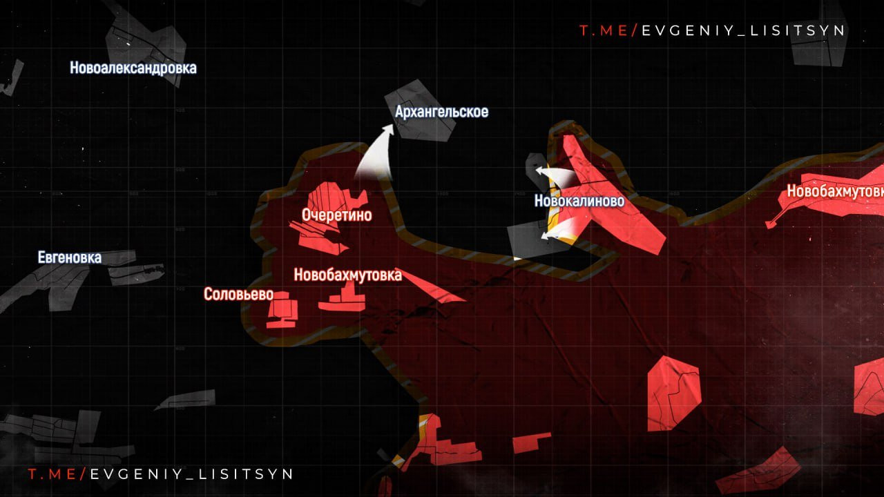 Идёт зачистка Новокалиново и Керамика, с дальнейшим продвижением на север в сторону Архангельского. К этому населённому пункту отошел украинский гарнизон, отступивший из Очеретино, и ВС РФ уже предпринимали попытки штурма окраин этого села. Сейчас бои идут на подступах к этому населённому пункту.
