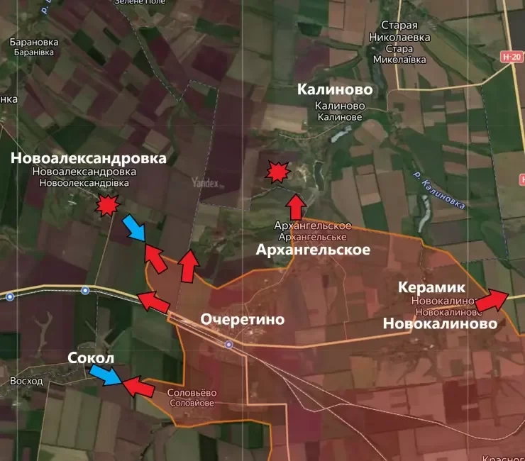 На текущий момент российские войска взяли под контроль посёлки Керамик и Архангельское на севере и Новобахмутовку с Соловьёво на юге от Очеретина. Движение ВС РФ идёт по ключевым высотам, создавая предпосылки для дальнейшего широкомасштабного манёвра.