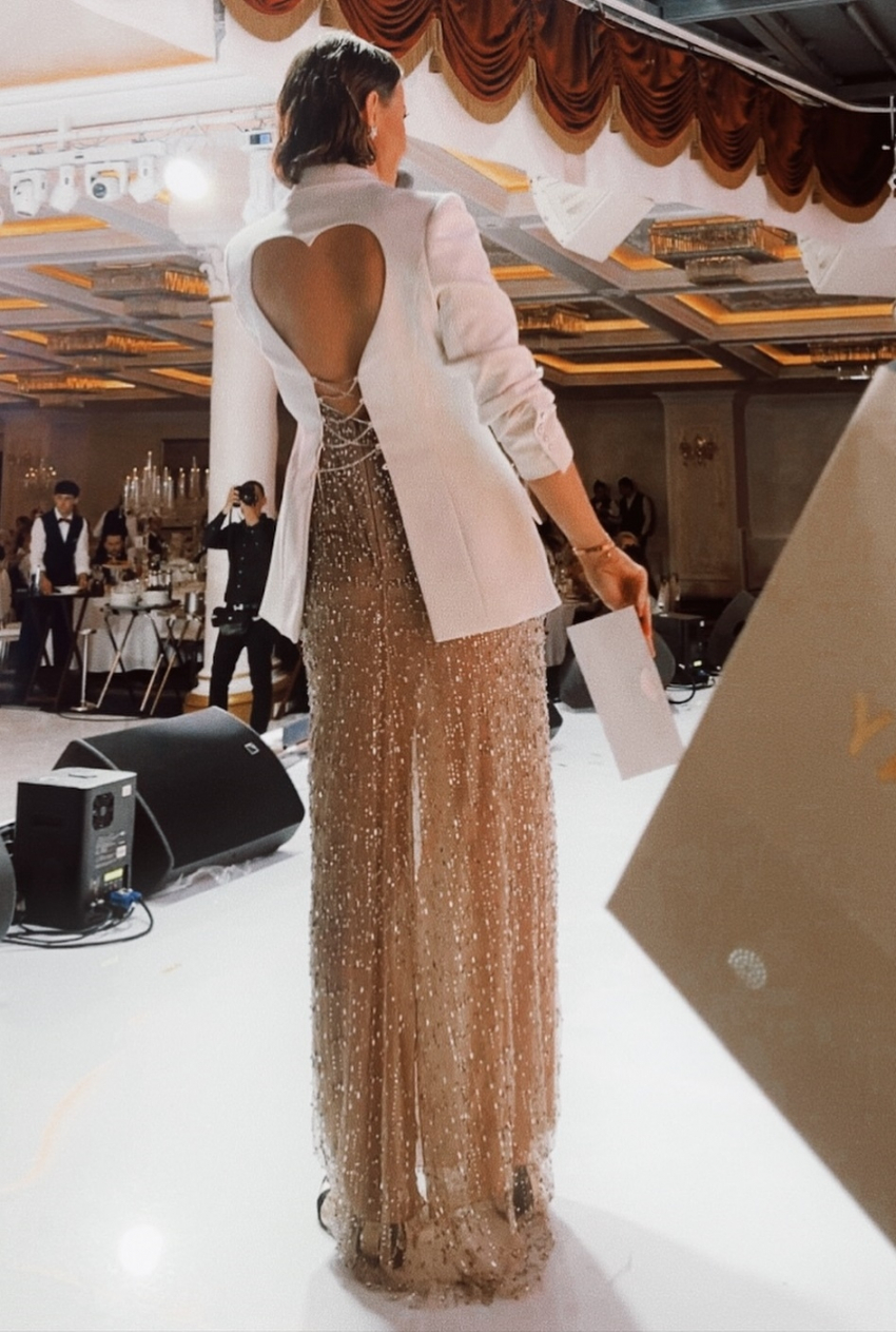 Ксения провела 15-ю премию «Рекорды Рынка Недвижимости». Она появилась в «голом» комбинезоне, украшенном стразами, и белом жакете с вырезом на спине. Свой образ дополнила балетками, серьгами, браслетом, эффектной укладкой.