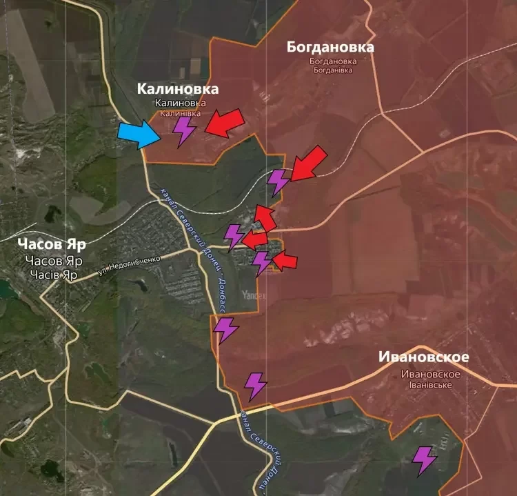 На ЧасовЯровском направлении РФ выдавили ВСУ за канал Северский Донец-Донбасс в Калиновке, приближаясь к полному освобождению села. В Часов Яре идут бои за западные высотки. Уничтожение переправ через канал и работа БПЛА и артиллерии осложнили логистику противника.
