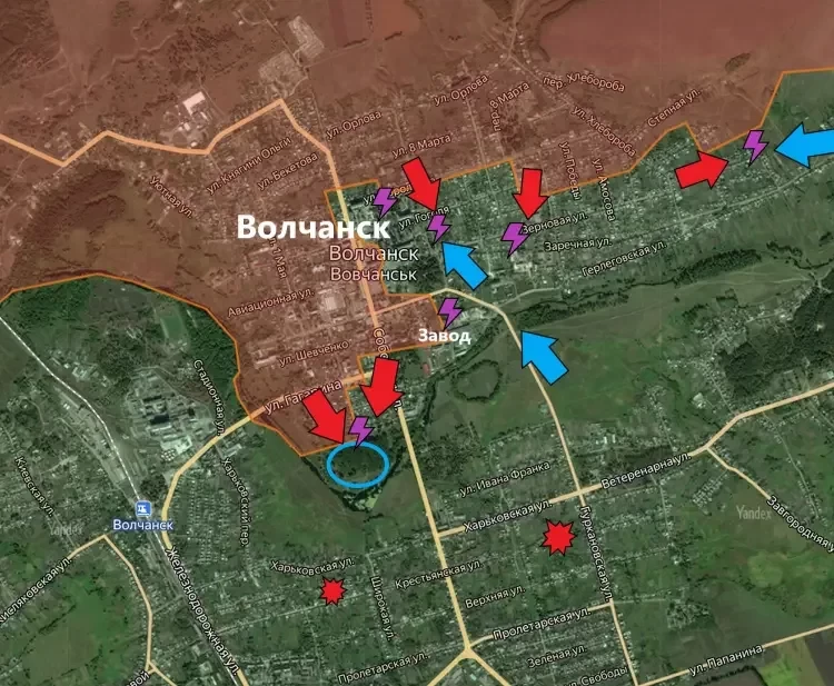 На Харьковском направлении фиксируются контратаки противника в населённом пункте Волчанск. Украинские формирования, удержав квартал многоэтажек на севере города, предпринимают попытки выбить подразделения ВС РФ с позиций к северу. В интернете появилось видео, демонстрирующее удары беспилотниками по пехоте противника на перекрестке улиц Короленко и Ленина. Хотя исход боя неясен, это говорит о расширении «серой зоны» в данном районе.