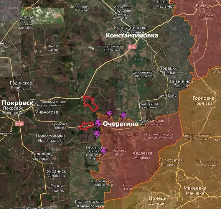 Довольно очевидные направления потенциального движения ВС РФ - на запад (в направлении Прогресса и Покровска), а также на северо-запад (в направлении Воздвиженки и трассы на Константиновку) пока что буксуют. Враг оказывает ожесточённое сопротивление, пишет PulsePen.