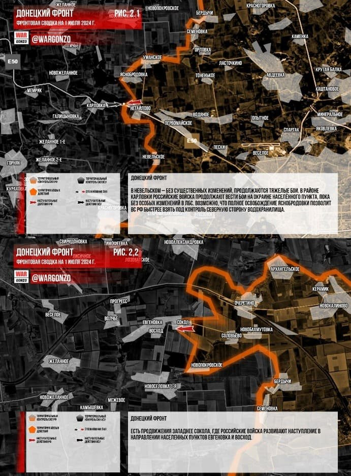 Украинские источники сообщают, что Сокол за нашими, но там еще ведется зачистка. Большая часть соседней Евгеновки уже тоже под контролем российских военных. Есть успехи северо-восточнее Яснобродовки и южнее Карловского водохранилища, где наши перешли р. Балка Домаха и вошли в Карловку.
