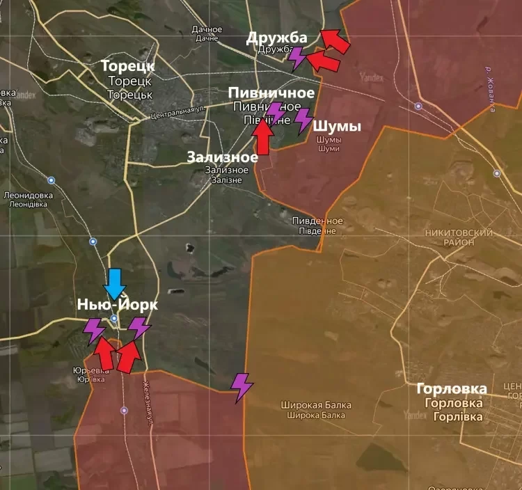 Кроме того, российские силы сосредоточились вблизи Торецка на Донбассе. Для обороны населенного пункта командование ВСУ задействовало 95-ю десантную бригаду. Также ВС РФ принимают тактику по продвижению, которую успешно опробовали в Авдеевке.