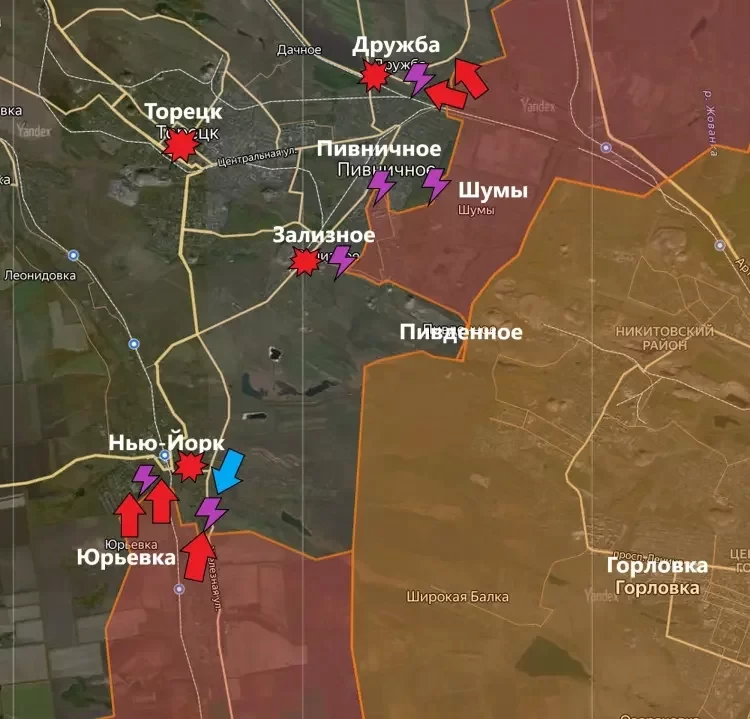В Нью-Йорке (Новгородском) штурмовые подразделения ВС РФ пытаются продвинуться к Новгородскому машиностроительному заводу. Чуть восточнее идут встречные бои на улице Железной, информирует PulsePen.