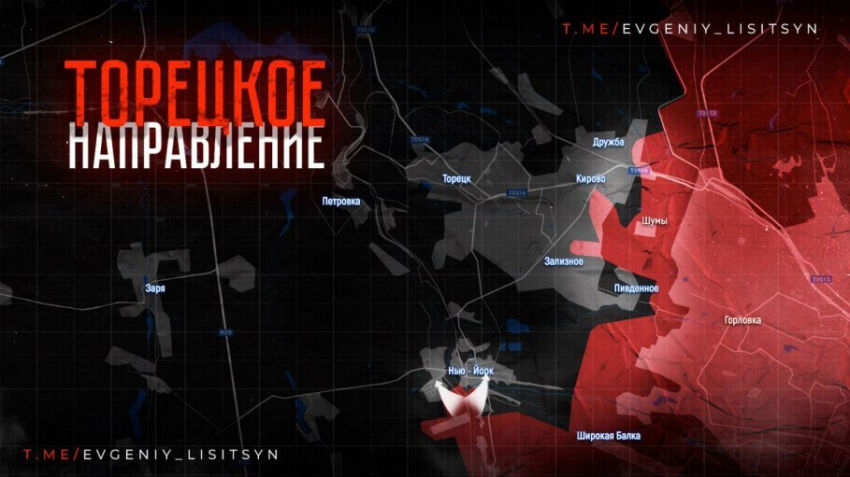 На Торецком направлении в Новгородском (Нью-Йорке) российская армия вошла в тыл ВСУ-шникам с восточной стороны и замкнула там два батальона ВСУ. В окружение рискуют попасть около тысячи украинских солдат. Также на этом участке фронта ВС РФ заняла бо‌льшую часть многоэтажек в Кирово (Северном).