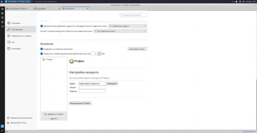 Чтобы использовать «Р7-Диск» для хранения или прикрепления крупных файлов из «Р7-Диск» к исходящим сообщениям, необходимо выполнить настройку в «Органайзере».