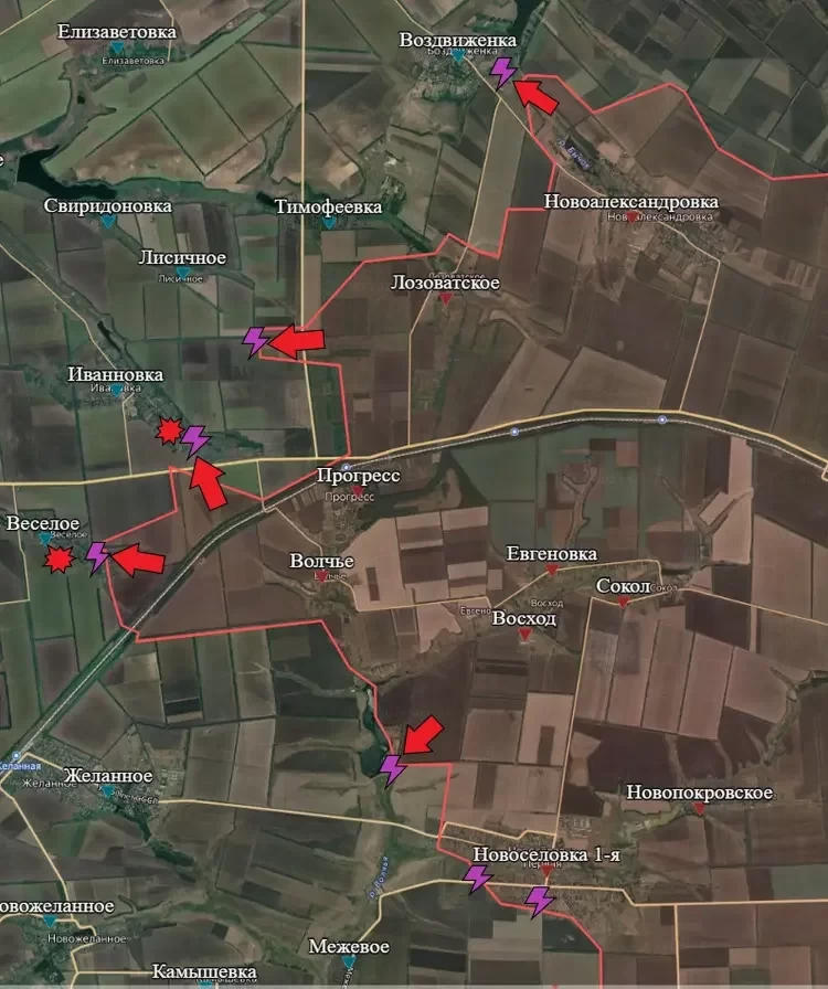 Продолжаются встречные бои на севере и юге Карловского водохранилища. Уже несколько недель нашим бойцам не удаётся расширить зону контроля. Предположительно, штурм Карловки начнётся после того, как наши бойцы смогут пересечь балку Домаха и подобраться к населённому пункту с юго-востока.