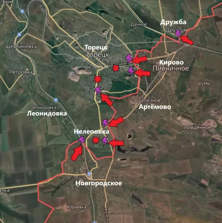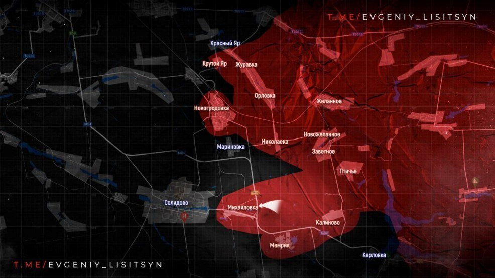 На Покровском направлении подразделения ВС РФ продвинулись севернее Новоторецкого. Далее на пути наших бойцов - Миролюбовка и Елизаветовка. А ещё чуть севернее - трасса Покровск - Константиновка, которую пока что не удалось перерезать.