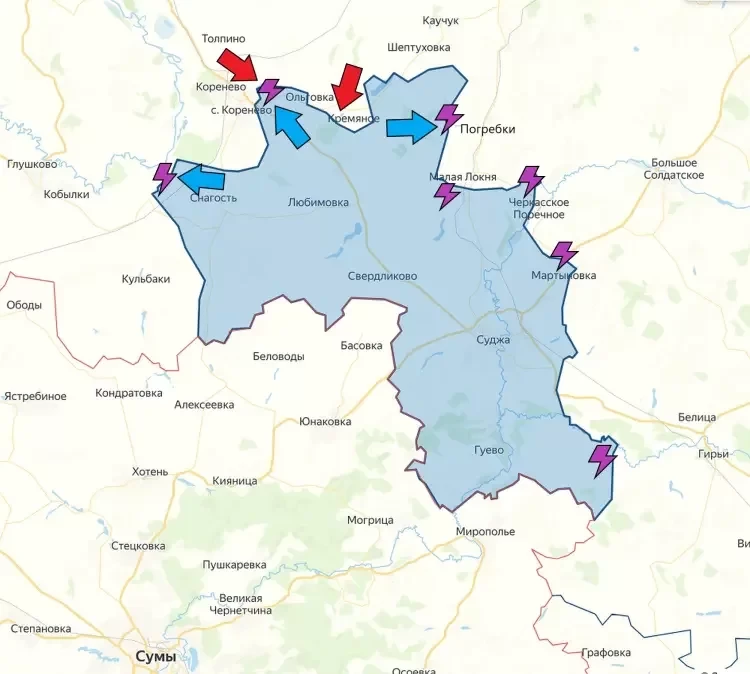 В Суджанском районе рядом с Малой Локней продолжаются бои, наши бойцы сдерживают натиск противника. ВСУ же бьют не только в лоб, но и пытаются зайти с фланга. Так врагу удалось немного продвинуться в сторону Погребков, которые располагаются севернее Малой Локни, пишет PulsePen.