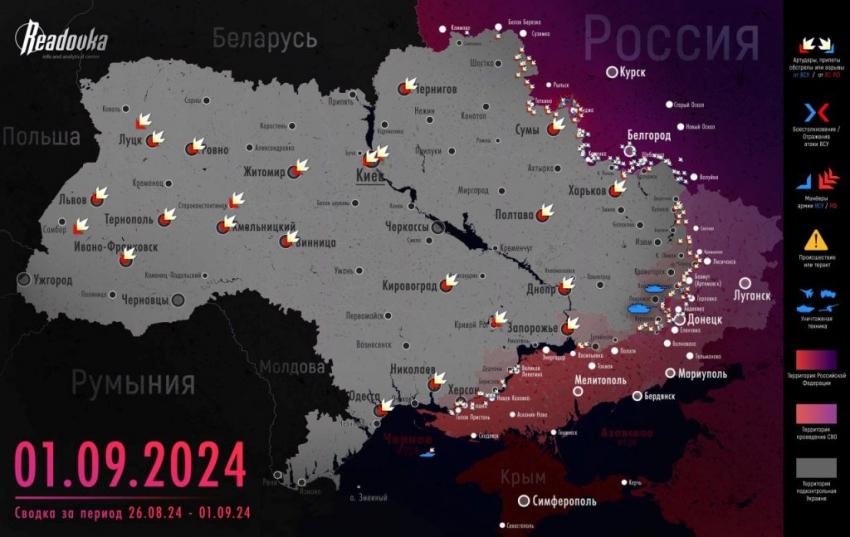 Последняя неделя лета по ощущениям оказалась самой ударной на фронте за последнее время — даже массовый налет ракет и «гераней» быстро ушел на задний план, пока на передний высыпали топонимы Новогродовка, Гродовка, Селидово, Карловка, Украинск, Мирноград и Покровск, и все вместе. Такого, в самом деле, давно не было - масштабы закрашенных областей впечатляют, а все из-за кровавого курского прыжка ВСУ. Об этом сообщает Telegram-канал Readovka.