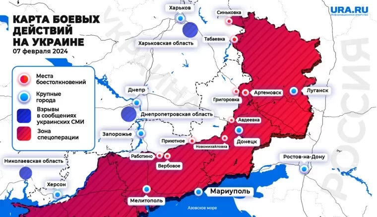 Свежая хроника из зоны специальной военной операции (СВО) на Украине по данным на 7 февраля 2024 года, новости, а также свежая карта боевых действий — в материале нашего сайта N4k.
