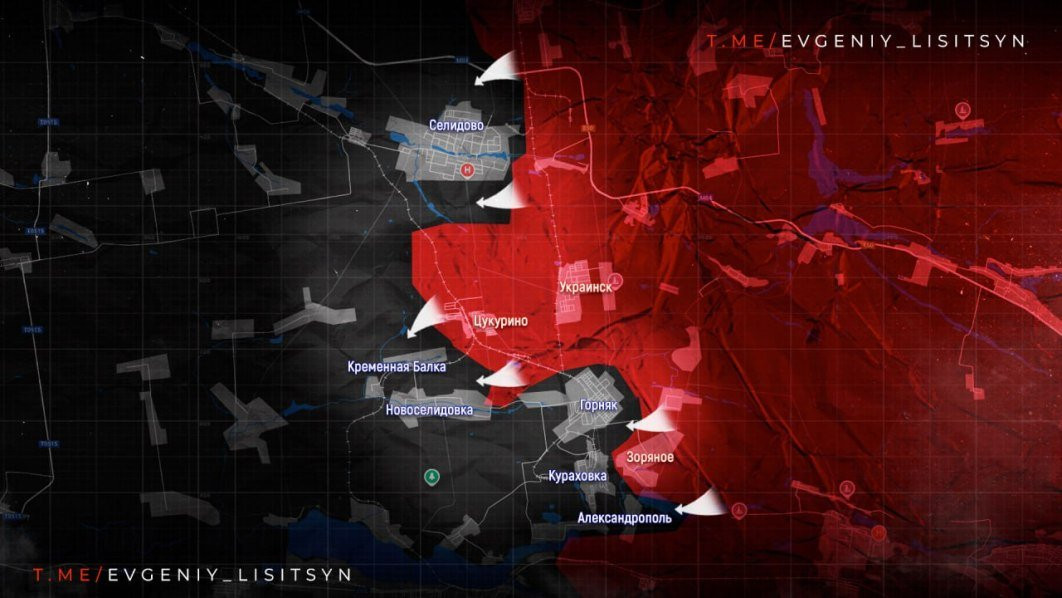 На Покровском направлении возобновились бои за Воздвиженку, что может позволить российским войскам продвинуться к Мирнограду. В районе Селидово ВС РФ продвинулись на 1 км, установили контроль над заводом ЖБИ и продолжают окружение украинских сил в Горняке и Кураховке, сообщает в Telegram-канале военкор Евгений Лисицын.