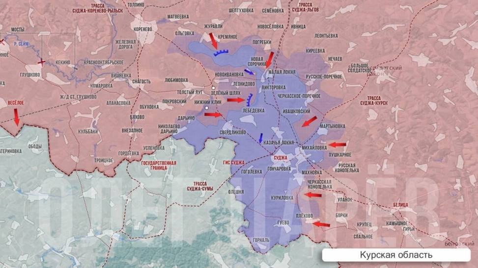 Из Суджанского района начали поступать первые свидетельства, подтверждающие факт наступления российских войск. В интернете опубликованы кадры атаки бронегруппы, перемещающейся вдоль Орловки южнее Погребков. Вероятно, события происходили тогда же, когда стали поступать сообщения о заходе ВС РФ в Старую Сорочину. На текущий момент зафиксировано продвижение по меньшей мере на несколько километров в южном направлении.