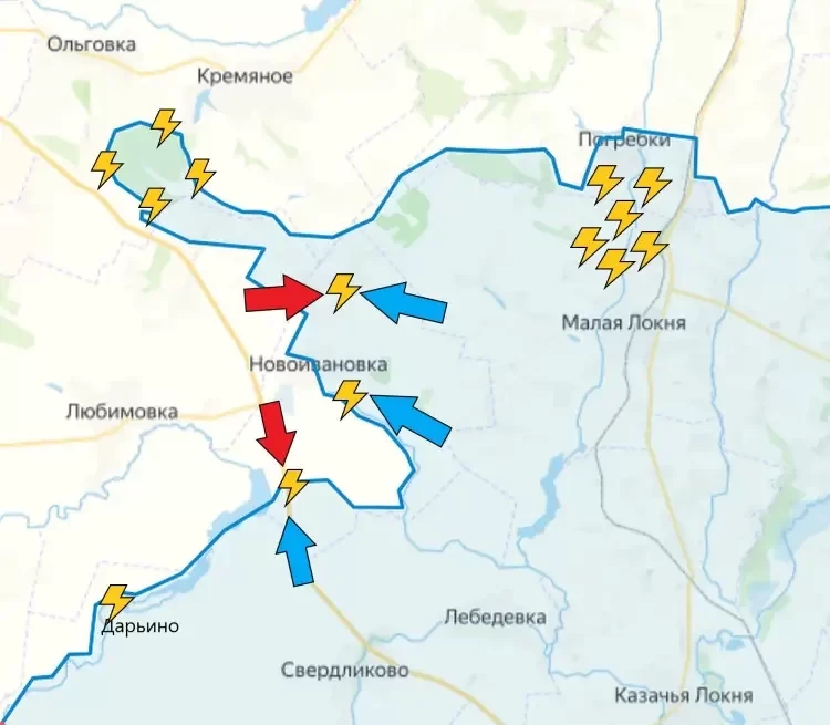 В Дарьино ВСУ продолжают ожесточенно сопротивляться, стараясь удержаться в селе. Выше по фронту наши военные стараются потеснить противника в Ольговском лесу, а также в лесах у Малой Локни. Идут бои у Погребков. Украинские каналы сообщали о попытках наших военных на лодках форсировать водоем вблизи Погребков возле дамбы.