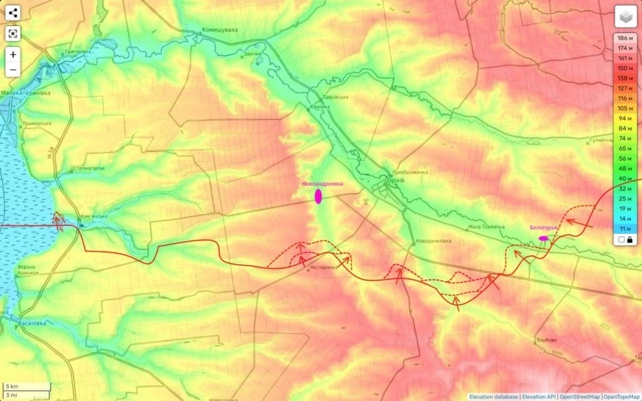Третий участок - на Белогорье. Здесь мы вчера вышли на восточную и южную окраины этого н.п. Также очевидное направление, если мы имеем целью охват Орехова с двух сторон по высотам (с запада и востока).