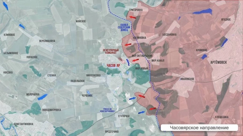 По мнению военного аналитика Михаила Онуфриенко, российская армия в скором времени может взять под контроль Часов Яр. Он отметил, что сейчас ожесточенные бои идут за местный огнеупорный комбинат.