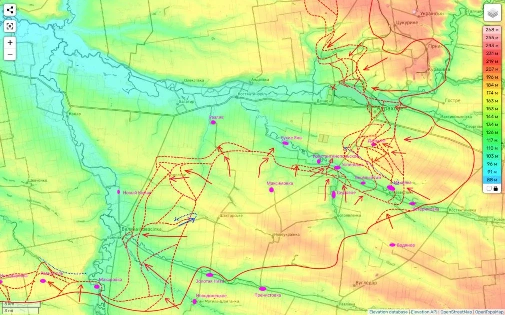 Основные наши усилия здесь сосредоточены северо-восточнее, где вчера мы сумели выбить противника из района Раздольного, что дает нам в перспективе возможность дальше двигаться на северо-запад, для более плотного блокирования района Большой Новосёлки и на север к трассе Запорожье-Курахово, для лишения снабжения этой важнейшей группировки ВСУ, которая по политическим мотивам режима в Киеве продолжает упорно сражаться в полуокружении.