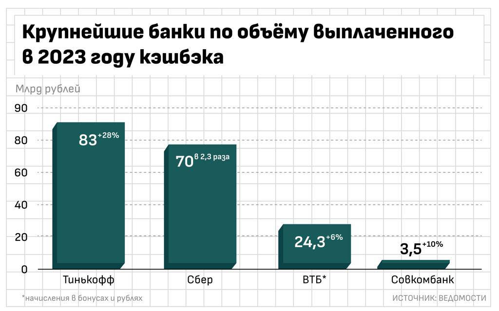 Тинькофф стал лидером среди российских банков по выплате кэшбэка клиентам. В сравнении с 2022 годом, прирост выплаченных в виде кэшбэка сумм составил 28%.
