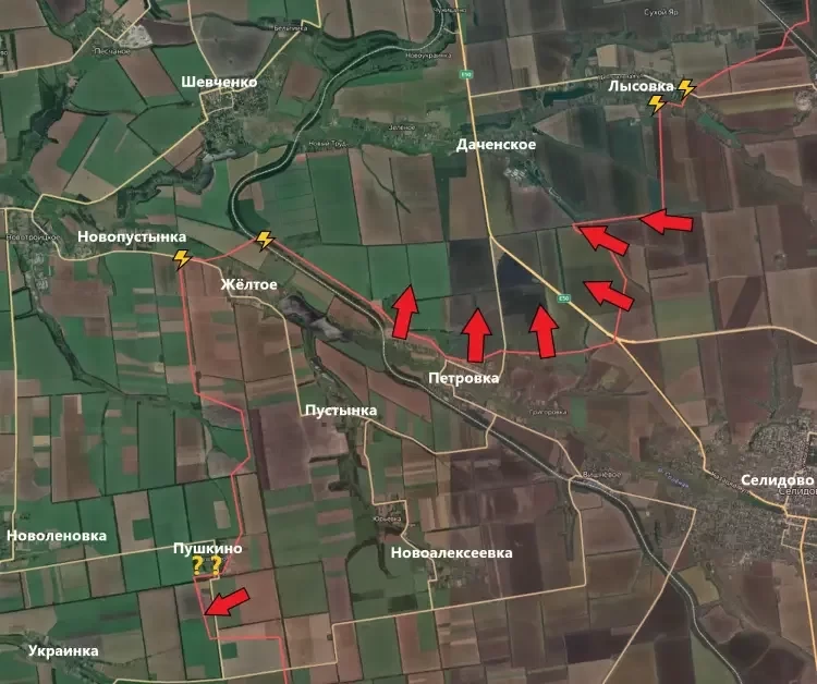 В сводке указывается на продвижение Вооружённых Сил Российской Федерации северо-западнее Селидово, где они движутся вдоль балки Даченская и нескольких лесополос в направлении села, в пределах шести километров.