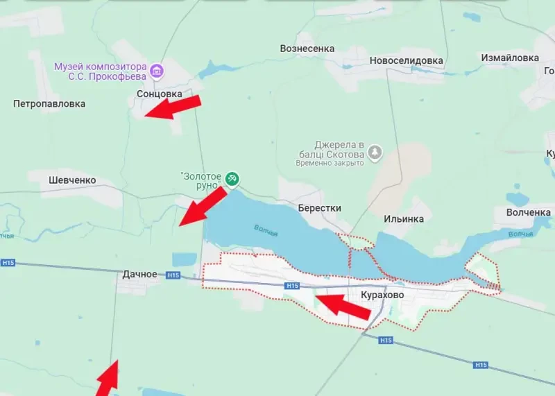 Сонцовка находится к северо-западу от Курахово. Контроль над Сонцовкой (напомним, что это Родина великого русского композитора Сергея Прокофьева) позволит ВС РФ продолжить охват Курхово с запада, а также выйти к очередному участку автомобильной дороги Т0515 Покровск-Константинополь. Северные участки этой автодороги в районе Новотроицкого и Шевченко уже под нашим контролем.