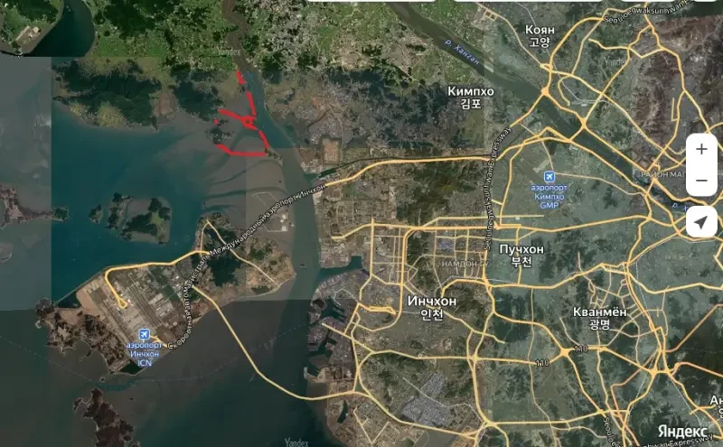 Но все же место узнаваемое. Комплекс гидротурбин и рабочих шлюзов должен был располагаться к западу от пролива между двумя мелкими островками, не поименованными даже на корейской карте. Дамба, отгораживавшая с востока высокий пруд, должна была идти от этих островков к острову Хвансандо, и от него еще севернее, до острова Канхвадо. Дамба, отгораживавшая низкий пруд, должна была идти до западной оконечности острова Сеодо, а оттуда поворачивать на запад до острова Домгёмдо, у которого располагался дренажный шлюз низкого пруда.