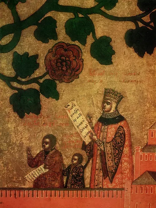 Мария Милославская с сыновьями Алексеем и Феодором. Фрагмент иконы Симона Ушакова «Похвала Богоматери Владимирской (Древо Московского государства)», 1668 г.