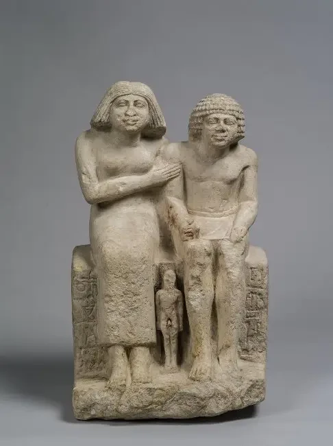 Скульптурная группа Униу с женой и сыном. VI династия. III тыс. до н. э. Размеры: высота 35, ширина 22,5, толщина 18 см. Дата поступления: 1911 г. Перевод надписей. Справа от мужчины: «Руководитель служителей дворца Униу». Слева от женщины: «Знакомая царя, его жена, любимая [им] Периникаи»