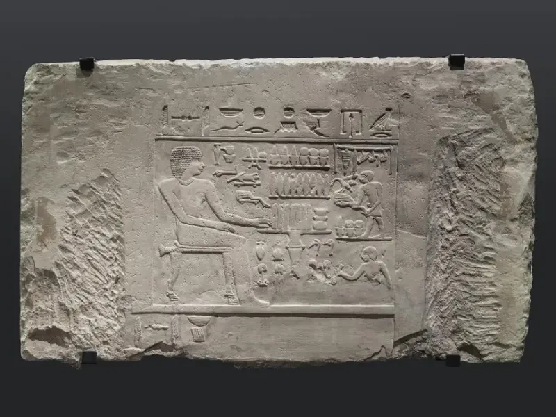 Рельефный блок из гробницы Изи. ок. 2500 гг. до н. э., кон. IV – нач. V династии. Мемфис. Размеры: высота 61,5 см, ширина 105 см. Дата поступления: 1911 г. Перевод надписей. Над изображением: «Начальник дома серебра, владыка почтения при своём господине (т. е. уважаемый своим господином) Изи». Под столиком: «1000 [кувшинов] пива, 1000 хлебов, 1000 аистов, 1000 гусей» (перевод О. Д. Берлева)