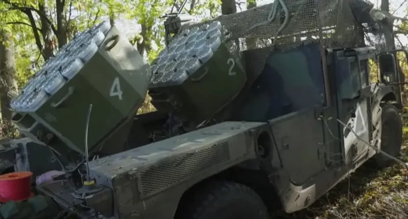 ВСУ опубликовали кадры, на которых показан импровизированный мобильный комплекс дистанционного минирования, размещенный на шасси легкого бронеавтомобиля HMMWV, в его кормовой части.