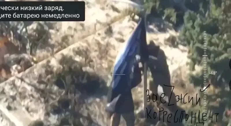 Оказавшись внутри, наши дерзкие воины поднимаются на верхний, второй этаж, и вывешивают российский триколор через окно. На этом вылазка не завершается. Бойцы куда-то возвращаются и, судя по кадрам, устанавливают на прилегающей к зданию площади на штанге знамя своей части, очевидно, неофициальное. Рядом в это время развеваются на ветру украинские полотнища, но это уже ненадолго.