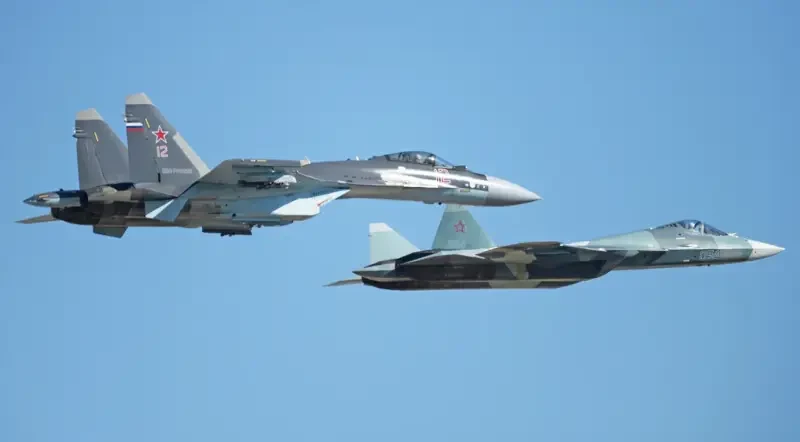 Самолеты Су-35 и Су-57 на авиасалоне в Ахтубинске, посвященном 95-летию создания летно-испытательного центра Министерства обороны России. Фото: AP