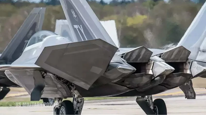 Крупный план характерных выхлопных сопел F-22 с управляемым вектором тяги в действии. Их уникальная «полусферическая конструкция» повышает скрытность F-22 даже при обзоре сзади. Говорят, что даже F-35 не может сравниться с F-22 по скрытности при обзоре сзади.