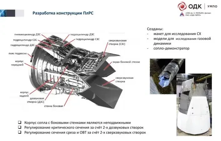 Поскольку «Сухой» «сопротивляется изменениям в самом планере», что в целом понятно, принцип «не мешайте самолету летать», Марчуков объяснил: «Вот почему мы придумали довольно сложную плоскую сопловую насадку».