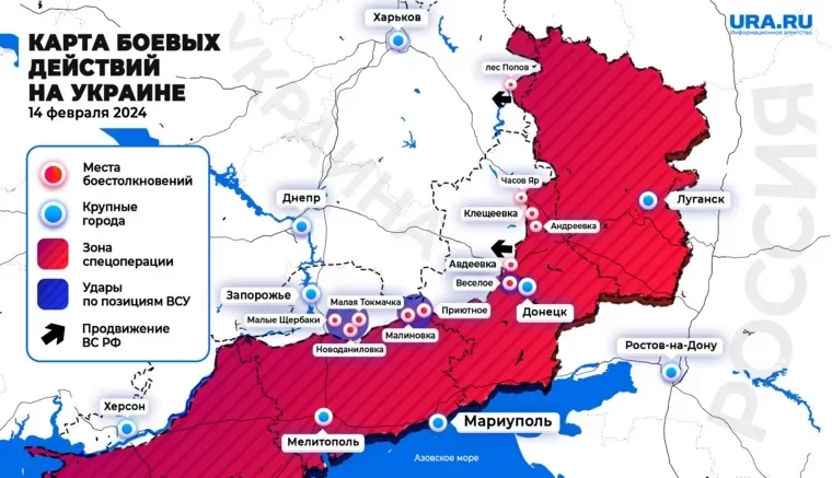 Уточнённая карта боевых действий на Украине от 14.02.2024: военная сводка из зоны СВО