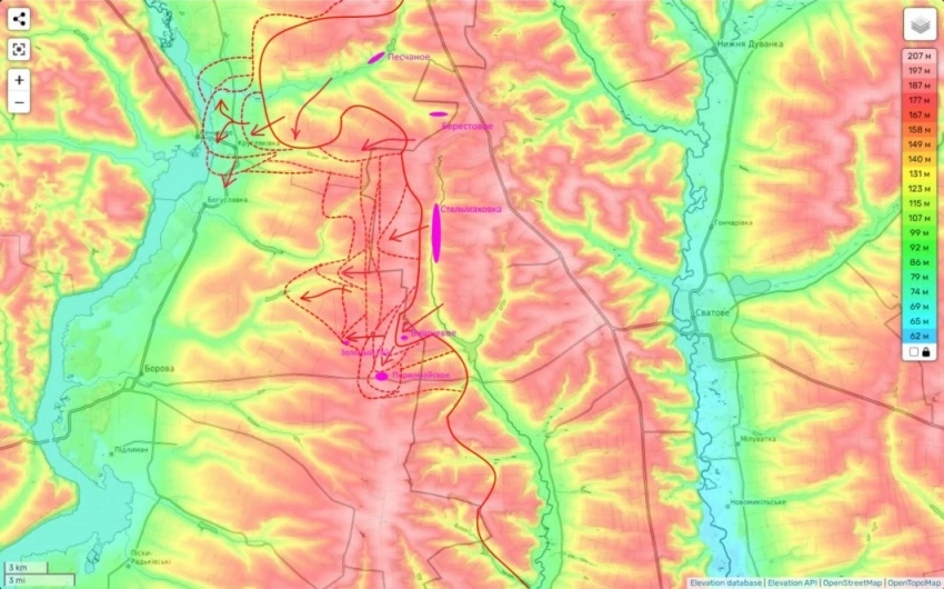 Наша армия постепенно спускается с холмов к Боровой (районный центр Харьковской области). За который бои могут начаться уже в самом начале следующего года. А может и раньше. До окраин Боровой по прямой нам осталось 5 км, а удобных рубежей обороны у противника здесь уже нет.