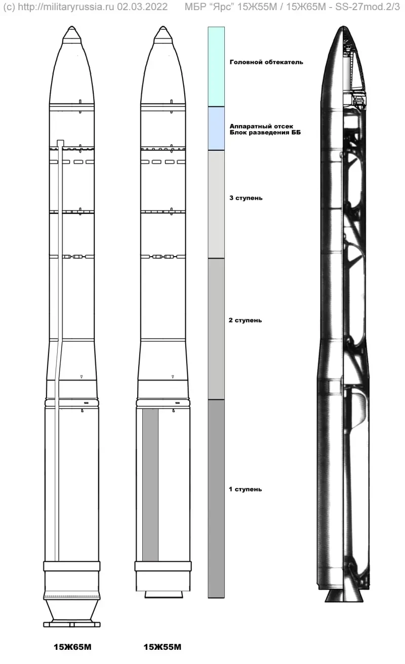 Схематичное изображение МБР «Ярс» (эта ракета во многом близка по конфигурации к МБР «Тополь-М»). MilitaryRussia.Ru