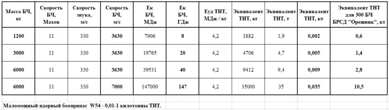 Как мы видим, БРСД «Орешник» с конвенциональной БЧ вполне может играть в «одной лиге» с маломощными ядерными зарядами.