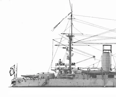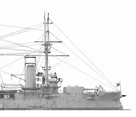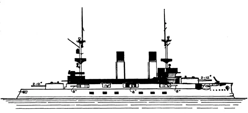Японцы убрали спардек, сняли боевые марсы, ходовую рубку и шесть башен с двенадцатью 6'' орудиями, сконцентрировав всё основное вооружение, за исключением передней пары 12'' орудий, на главной палубе, которая имеет такую же высоту надводного борта (от 18 до 20 футов), как у кораблей японского, британского и нашего флота. Поскольку перенос носовой 12'' башни на верхнюю палубу с неизбежным в таком случае срезанием части барбета был признан японцами слишком дорогостоящим мероприятием, высокий (28 футов) полубак оставили без изменений.