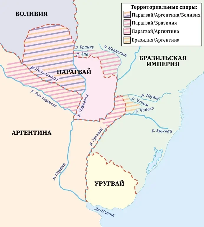 Территорию Парагвая сильно урезали, почти вдвое. Аргентина вообще предлагала ликвидировать Парагвай, разделить все земли. Но бразильское правительство отказалось от такой затеи, оно хотело иметь буфер между Аргентиной и Бразилией.