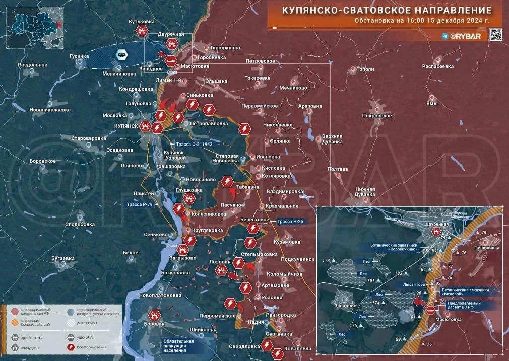 На Купянско-Сватовском направлении идут ожесточенные бои в районе Кругляковки и Загрызово. По некоторым данным, со стороны Масютовки ВС РФ осуществили высадку десанта на правый берег Оскола.