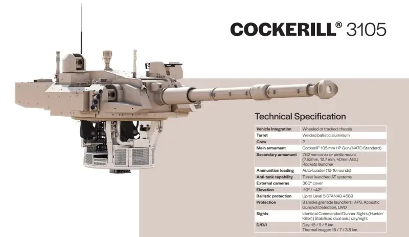 При производстве башни C3105 используется алюминиевая броня, обеспечивающая защиту на уровне 5 по STANAG 4569 (выдерживает попадание 25-мм БПС или БОПС). Она вооружена 105-мм пушкой типа HP («высокого давления») и автоматом заряжания (БК на 12-16 снарядов). Углы вертикального наведения -10° / +42°. Расстояние обнаружения, распознавания и идентификации цели составляет днём и с помощью тепловизора соответственно 18/9/5 км и 15/7/3.5 км.