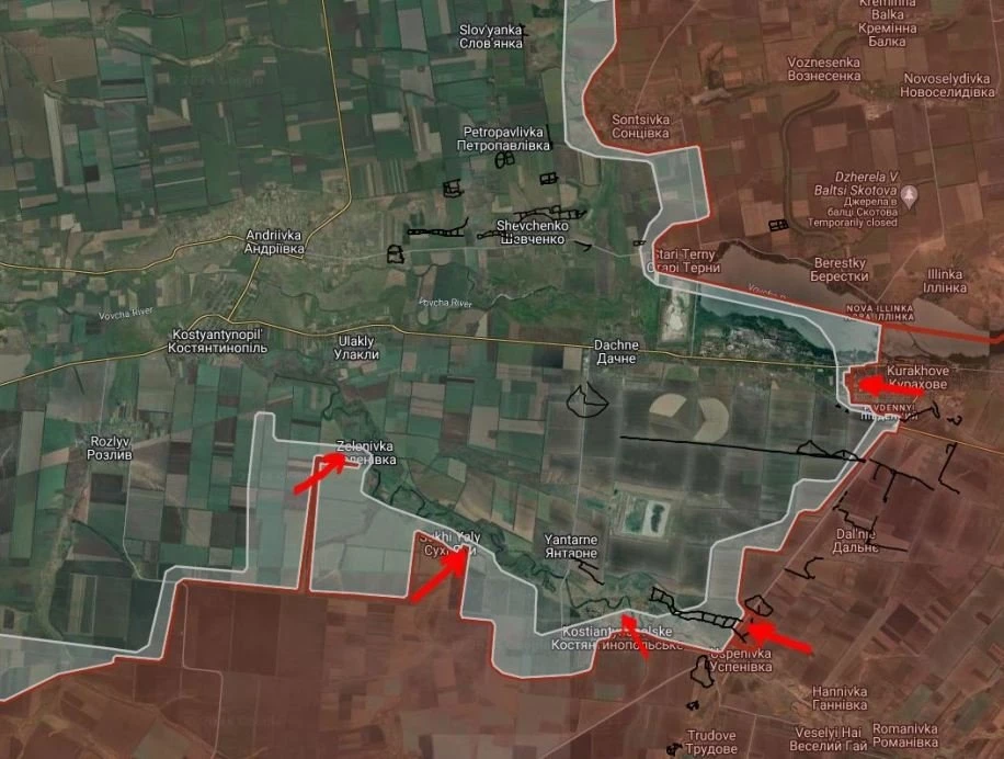 Наиболее активно продвижение идёт в западной части. Враг сообщает, что нашим бойцам удалось продвинуться на север от Новотроицкого, форсировав реку и выйдя к окраинам Волково. Сейчас бои идут за позиции у трассы на Покровск. Также наши бойцы закрыли «карман» между Новотроицким и Песчаным. У самого Песчаного идут бои на подступах к селу, сообщает PulsePen.