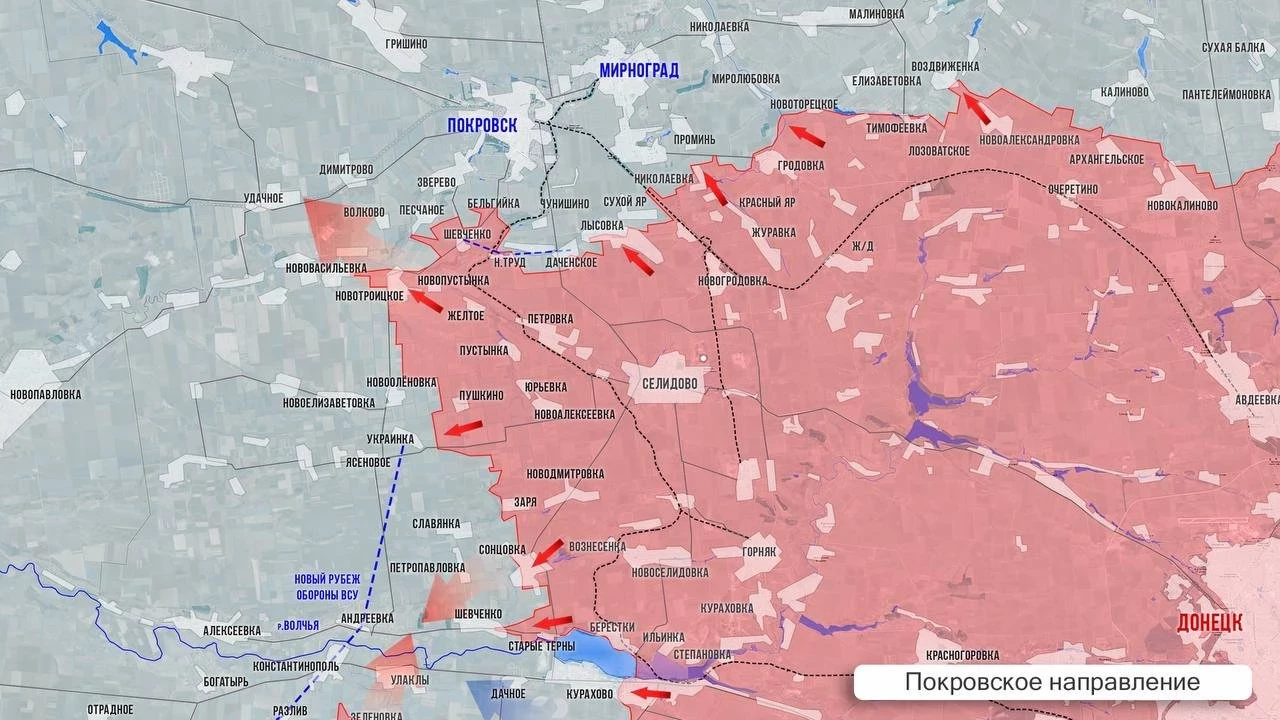 На Покровском фронте интенсивные бои идут вокруг Покровска и Мирнограда. В районе Шевченко ВС РФ усилили натиск на гарнизон ВСУ в Песчаном. Западнее Новотроицкого наши провели неожиданный маневр: вступив в бои за Нововасилевку и закрепившись на ее окраинах, часть наших бойцов форсировала р. Соленая и вошла в Волково, что в 1 км к юго-западу от Песчаного. К западу от Шевченко идут бои в районе Нового Труда, Зеленого и Даченского, где наши пробиваются на север. Вдоль ж/д на Чунишино есть продвижение примерно на 500м. Южнее ожесточенные бои идут по линии сел Нововасилевка-Новооленовка-Украинка-Славянка-Петропавловка.
