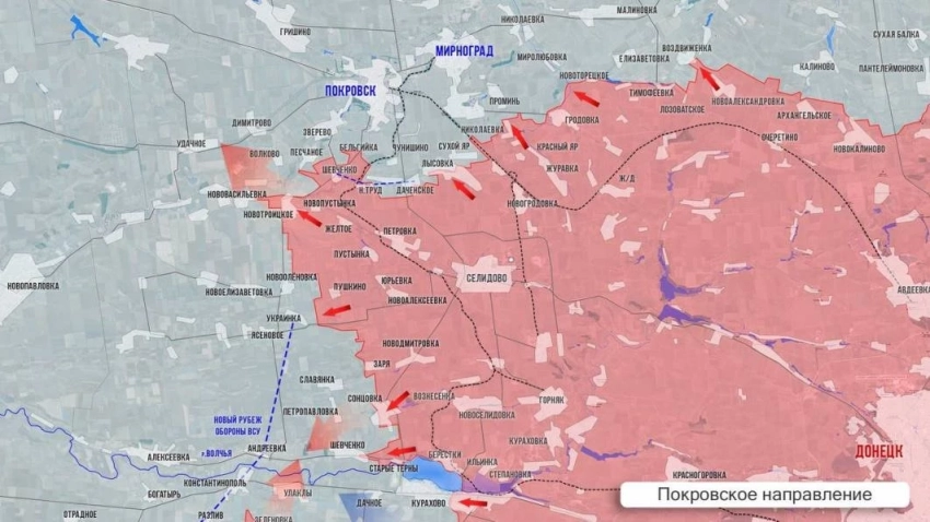 На Покровском фронте ВС РФ взламывает оборону вокруг Покровска и Мирнограда. Со стороны Шевченко натиск ВС РФ идет не только на Песчаное, но и на Зверево. От Волково наши вышли на окраины Соленого, довольно сильно продвинулись и в Нововасилевке. Восточнее бои идут по всей линии от Нового Труда и Даченского до Миролюбовки – везде наши войска имеют тактические успехи. Южнее наши бьются одновременно в Новооленовке, Украинке, Славянке, продвижение есть в каждом из этих сел. Со стороны Старых Тернов армия России штурмует позиции ВСУ в Шевченко и в направлении Андреевки.