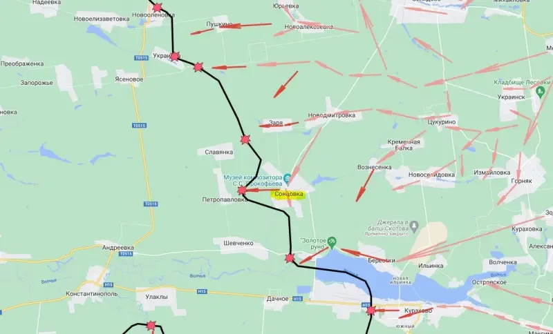 Село Сонцовка, оно же Красное, на Кураховском направлении было освобождено в начале второй декады декабря, хотя бои за него начались еще в ноябре. На 11 декабря ВС России контролировали 90% населенного пункта, известного тем, что является родиной великого русского композитора Сергея Прокофьева. Контроль над Сонцовской (Красным) позволяет охватить Курахово с запада.