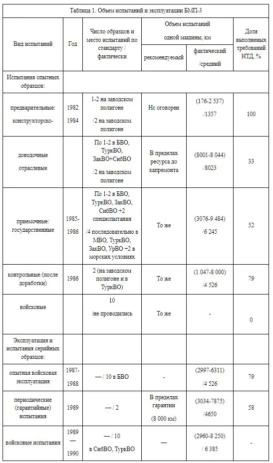 Рассмотрим, какие из этих причин относятся к БМП-3. Как известно, в середине 70-х гг. на основании опыта испытаний БТТ были выработаны рекомендации по числу, объёму и месту испытаний опытных образцов. Они нашли отражение в стандартах, согласно которым должны испытываться 20-30 машин до выхода практически всех их в капитальный ремонт. Однако из-за недостаточных мощностей опытного производства и ряда организационных причин число испытываемых образцов БМП-3 было меньшим, чем предусмотрено стандартом (табл. 1). Объём испытаний составил только 37 % от рекомендованного стандартом. Практически все испытания продолжались значительно дольше запланированных сроков из-за большого числа отказов и отсутствия запчастей. Всего с учётом войсковой эксплуатации испытано 34 машины; суммарный объём их испытаний составил около 200 тыс. км.