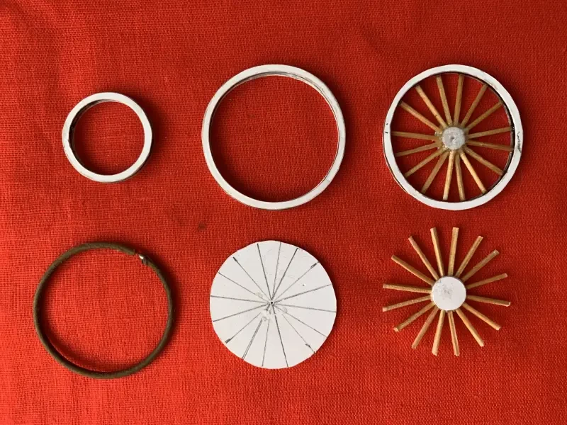 Прежде всего надо было сделать колёса. Небольшие, но прочные. Сделал кольца из проволоки толщиной 2 мм, накрутив её на подходящие деревяшки. Затем четыре раза подряд наклеивал эти кольца на чертёжную бумагу и обрезал снаружи и изнутри. Круги, что вырезал изнутри, расчертил под спицы. Спицы из реек толщиной 1 мм наклеил на ступицы и обрезал по внутреннему диаметру колёс. Ступицы вклеил в колёса и все сборки покрасил акрилом в красный цвет.