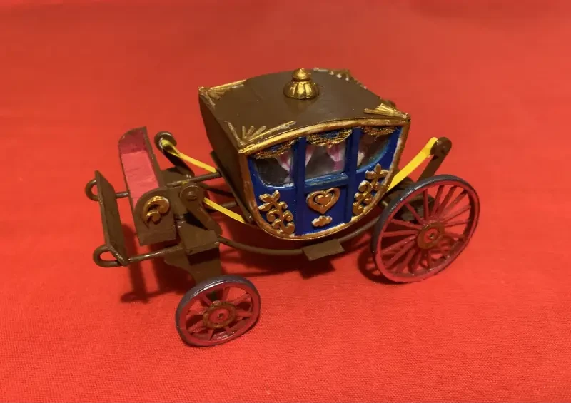 И совсем недавно судьба послала мне подарок из 87-го: зашёл в антикварный магазин неподалёку от дома, а там точно такой же веер, как тогда. Купил его, и… жена потребовала сделать ещё одну карету уже на нашу винтажную ёлку с самодельными игрушками! Нашёл в Интернете два вида карет, скопировал, и работа закипела.